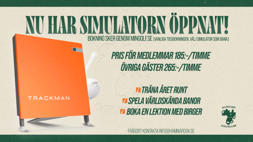 Bokning av speltid i Trackman-simulatorn på Hammarö GK gör du nedan eller via "Min Golf". Man bokar 1 timme i taget, vill man boka ytterligare tid gör man en ny bokning. För att bokningen skall gå igenom måste man betala avgiften annars försvinner bokningen.